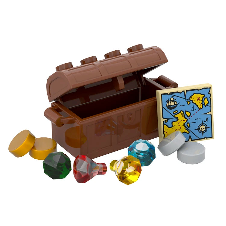 1 x Reddish Brown Treasure Chest Bottom 1 x Reddish Brown Treasure Chest 1 x Treasure Map (2 x 2 Printed Tile, Tan) 2 x Silver Coins (1 x 1 Round Tile, Light Grey) 2 x Gold Coins (1 x 1 Round Tile, Pearl Gold) 1 x Red Jewel/Diamond 1 x Green Jewel/Diamond 1 x Blue Jewel/Diamond 1 x Yellow Jewel/Diamond |