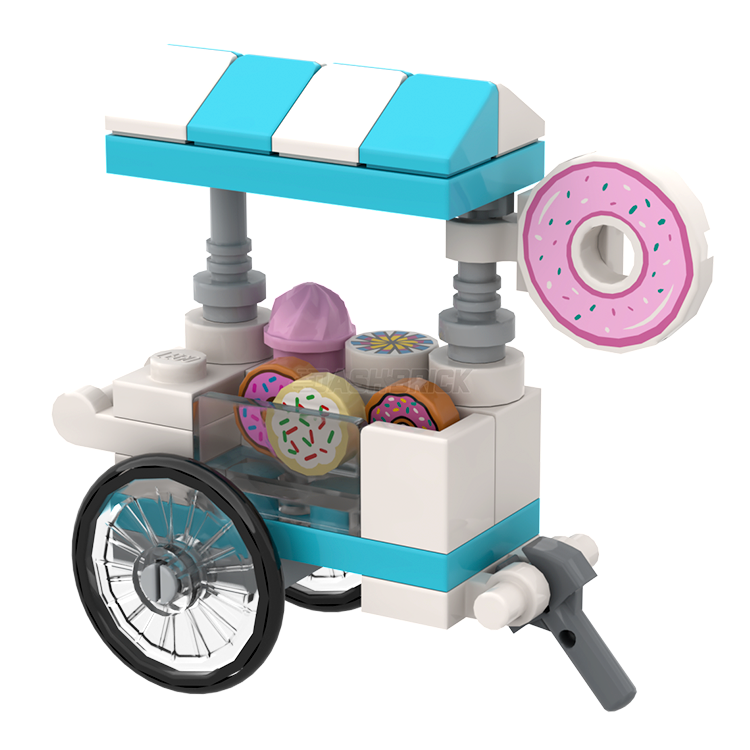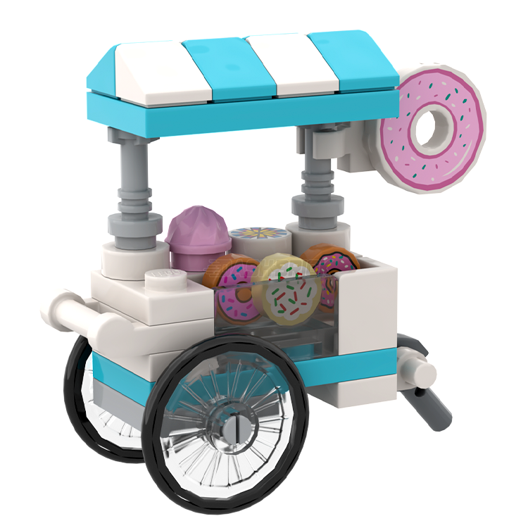 Introducing the 'Sweet Circle Donut Cart,' a star attraction in the Dashbrick Brickside Delights Wagon series. These custom creations are handcrafted crafted by our design team, offering an exciting addition to any expanding LEGO City.